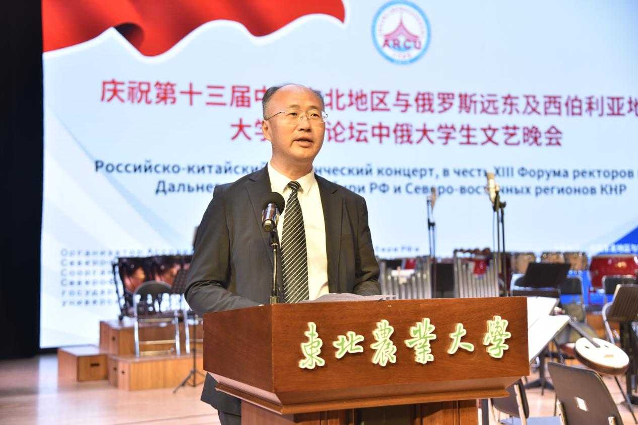 中俄大学联盟中方主席、东北农业大学校长付强和中俄大学联盟俄方主席、太平洋国立大学校长马尔芬•尤里•谢尔盖耶维奇在文艺演出中致辞。付强表示,200余名中俄高校领导和代表齐聚哈尔滨,共襄校长论坛,共谋合作大计,共话中俄友谊,相信在中俄两国元首的战略引领下,在中俄两国教育主管部门的大力支持下,中国东北地区与俄罗斯远东及西伯利亚地区大学联盟的工作必将蓬勃发展、再创辉煌。各校联手为各位嘉宾和同学们献上一场视听盛宴,以此庆祝中俄高等教育合作的累累硕果,展现中俄大学联盟十一年来的显著成就,传承中俄青年历久弥新的深厚友谊,续写新时代中俄友好交往新篇章。