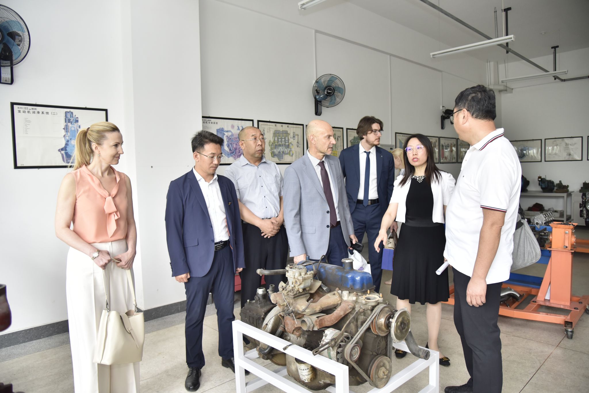 代表团在工程学院党委书记黄步海,副院长王金峰、王立军的陪同下参观了铣工实训室、模拟工场实训室、车辆拆装实验室、激光切割实训室等学生实习实训场所。普鲁滕科对学院在安全规范管理方面的经验印象深刻,对学院在本科生人才培养和对大学生科技创新中心的支持表示称赞。